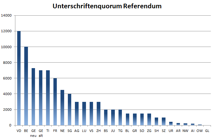 Auffallend ist, dass die Unterschiede zwischen den Kantonen hinsichtlich der Unterschriftenhürden beträchtlich sind: So müssen im Kanton Zürich mit 3000 Stimmberechtigten nur gerade 0.34 Prozent des Stimmvolks überzeugt werden, um ein Referendum zustande zu bringen, in Neuenburg hingegen 4.08 Prozent – mehr als 12 mal mehr.