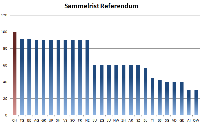 [4] Ausgeklammert wurden jeweils Kantone, in denen eine einzelne Person alleine eine Initiative einreichen kann (Glarus und Appenzell-Innerrhoden) bzw. das Referendum ergreifen kann (Glarus).