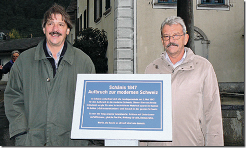 Der St. Galler SP-Ständeratskandidat Paul Rechsteiner und der Schäniser Gemeindepräsident Erich Jud weihen die Gedenktafel an die Wahl von 1847 ein. Bild: Zürichsee-Zeitung, 11. Oktober 2011