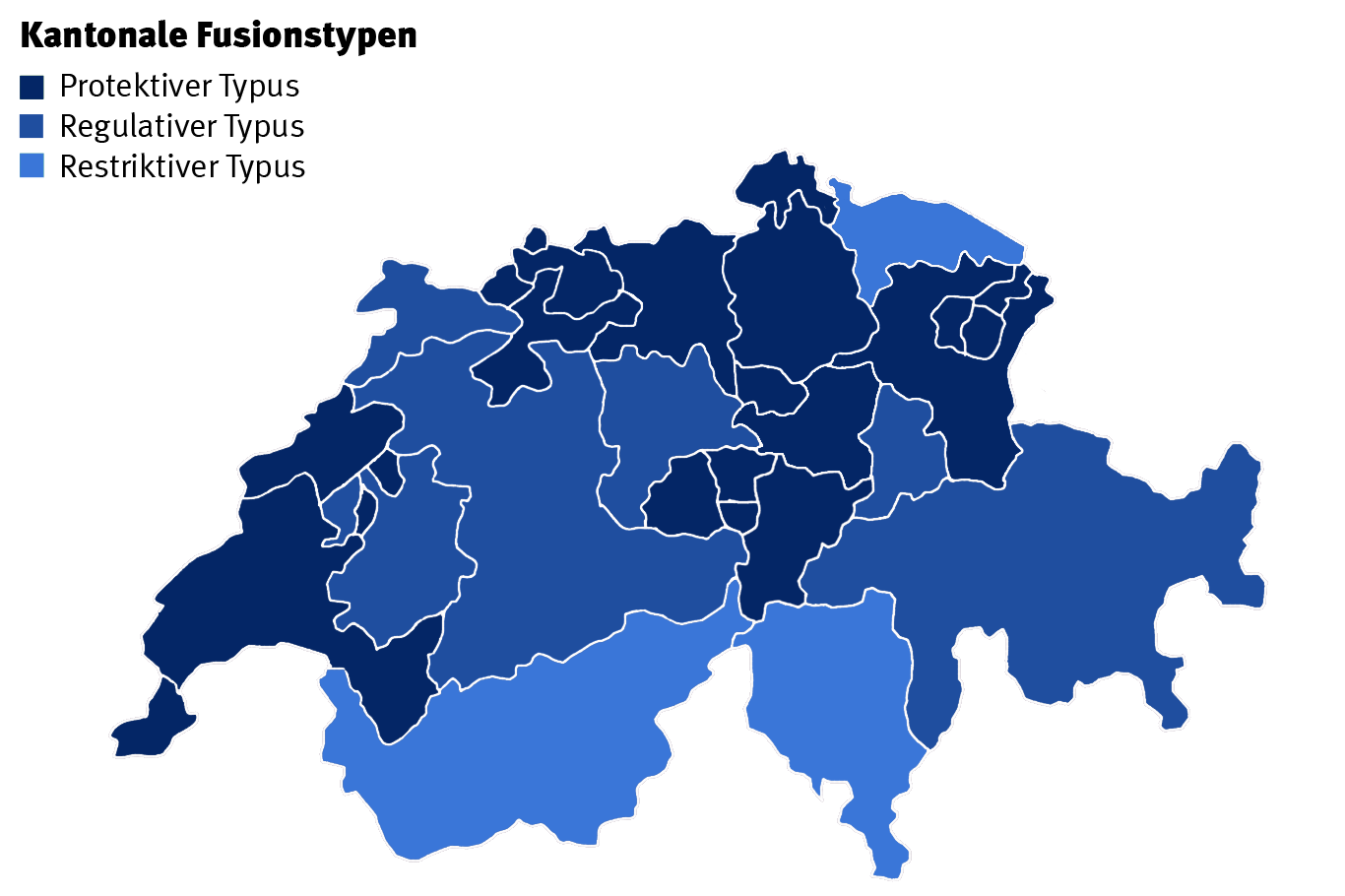 Den zweiten regulativen Typus bilden die sechs Kantone (BE, FR, GL, GR, JU, LU), in denen eine Zwangsfusion zwar rechtlich möglich ist, bisher jedoch nie angewandt wurde.