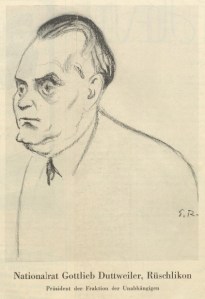 Mit der Einführung des Proporzes und der damit verbundenen Vergrösserung der Wahlkreise verlor diese Strategie an Relevanz, zumal nur wenige Politiker über ihren Kanton (der ja nun ihr Wahlkreis war) hinaus Bekanntheit erlangten. Doch es gab Ausnahmen. Eine davon war Gottlieb Duttweiler. Der Migros-Gründer war bereits landesweit bekannt, als er 1935 in die Politik einstieg und in Zürich, Bern und St. Gallen «Unabhängige Listen» für die Nationalratswahlen lancierte (aus denen später der Landesring der Unabhängigen entstehen sollte).[15] Seiner nationalen Ausstrahlung bewusst, trat er in allen drei Kantonen gleich selber als Spitzenkandidat an.