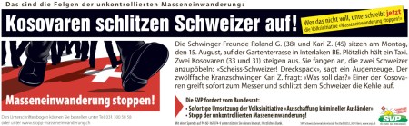 Damit einher ging ein neuer Stil, den Blocher bereits mit der Zürcher SVP kultiviert hatte und den die nationale Partei bis heute pflegt: provokative Forderungen, zugespitzte Slogans, um die öffentliche Aufmerksamkeit auf sich zu ziehen. Bekanntheit erlangte etwa das sogenannte «Schlitzer»-Inserat: Im August 2011 wurde im Berner Oberland ein Schweizer von einem Kosovaren mit einem Messer schwer verletzt. Die SVP schaltete daraufhin ein Wahlkampfinserat mit dem Titel: «Das sind die Folgen der unkontrollierten Masseneinwanderung: Kosovaren schlitzen Schweizer auf!»