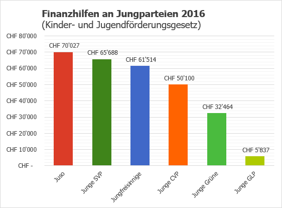 Finanzielle Bedeutung: vergleichsweise bescheiden. 2016 erhielten alle Jungparteien zusammen 286’000 Franken. Zum Vergleich: Der Dachverband Schweizer Jugendparlamente erhält für drei Jahre 3.3 Millionen Franken. Für die Jungparteien ist das Geld aber eine bedeutende Einnahmequelle.