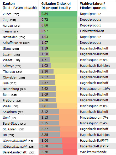 Natürlich spielen bei der Mandatsverteilung auch noch andere Faktoren eine Rolle. Beispielsweise führt ein gesetzliches Quorum, wie es immerhin zehn Kantone (in sehr unterschiedlicher Höhe) kennen, zu einer weniger proportionalen Verteilung der Mandate. Das erklärt zumindest teilweise den relativ hohen Wert des Gallagher-Index im Kanton Genf, der trotz Einheitswahlkreis im interkantonalen Vergleich im hinteren Mittelfeld rangiert. Auch das Verfahren der Mandatszuteilung (Hagenbach-Bischoff-, Sainte Laguë- oder Bruchzahlverfahren) hat einen Einfluss.